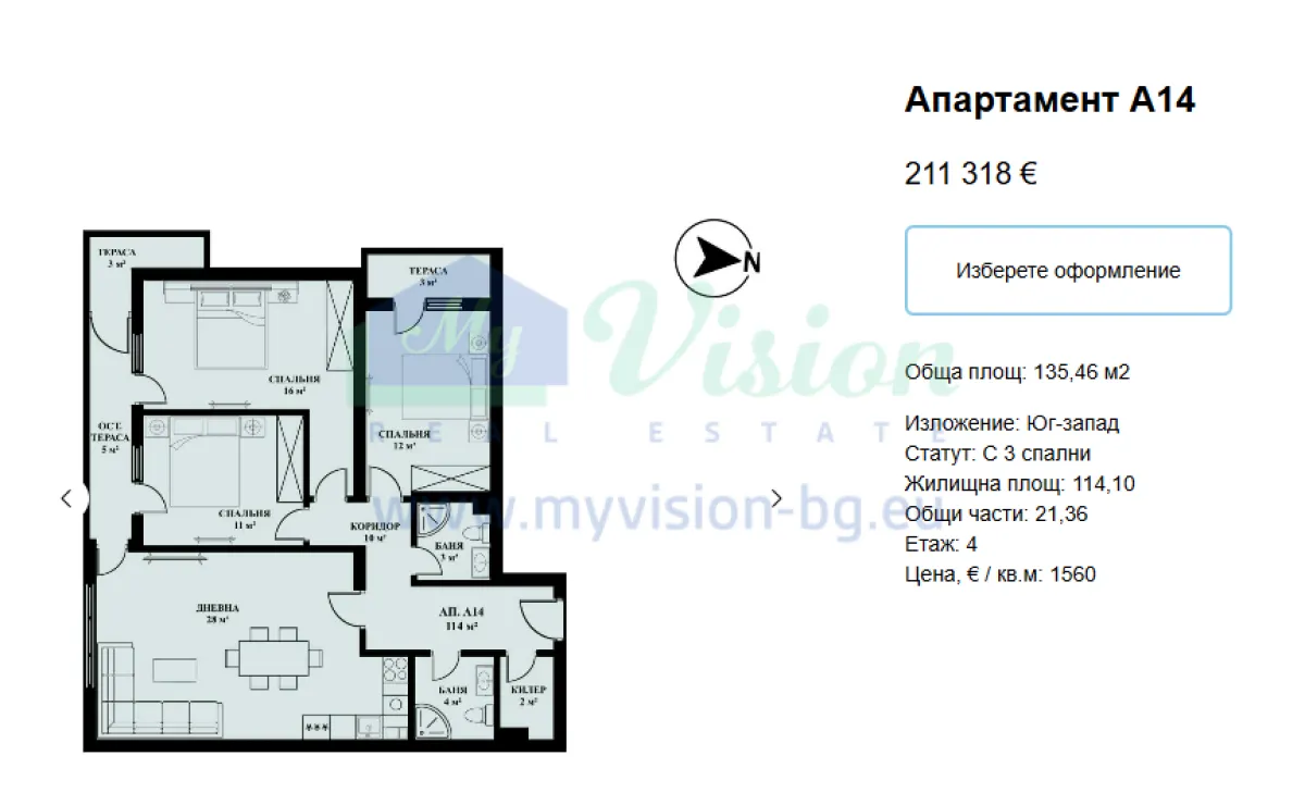 Ние от MyVision Real Estate сме горди да ви предложим четиристаен апартамент в нов жилищен комплекс, който се намира на комуникативно място в близост до обществен плувен басейн, спирки на градски транспорт, супермаркети “Billa” и “Lidl”, автоуслуги, сервизи, бензиностанции, разнообразие от магазини, пазар, училища и детски градини, зелени площи, болница, фитнес и заведения за хранене.