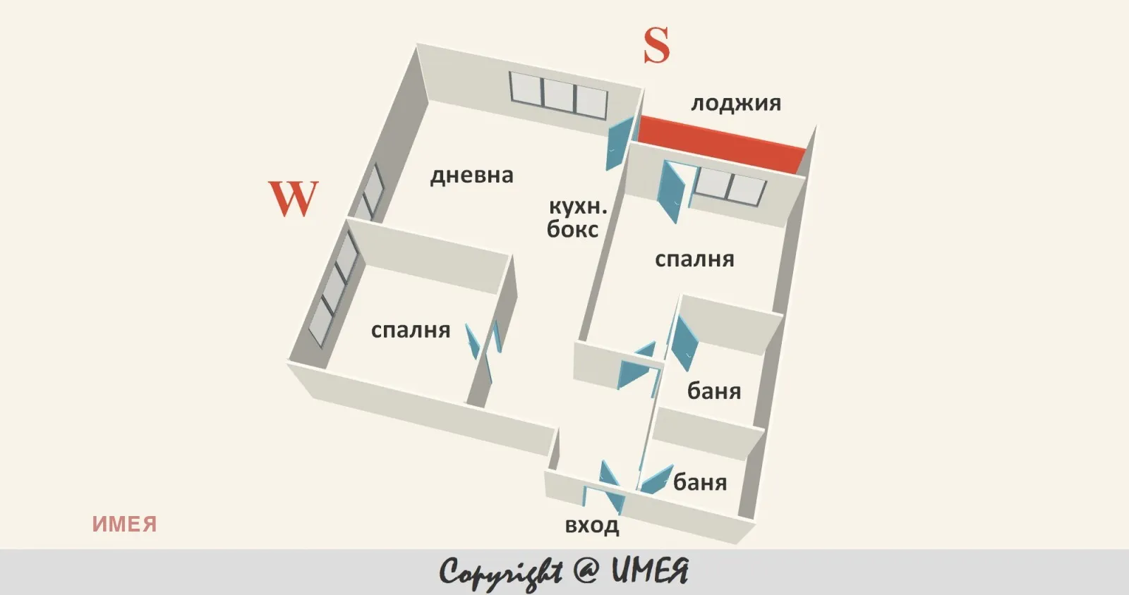 За апартамента: Апартаментът е с чудесни параметри като площ, етаж, разпределение и изложение. Намира се на етаж 2 от 18, площта му е 107 кв.м., състои се от антре, просторна дневна с кухненски бокс и трапезария, отделно 2 спални, 2 бани с тоал. и балкон-лоджия с излаз и от дневната, и от една от спалните. Изложение: юг / запад. Просторен, топъл, функционален апартамент. На шпакловка и замазка с висок клас ПВЦ дограма. Отопление: ТЕЦ.