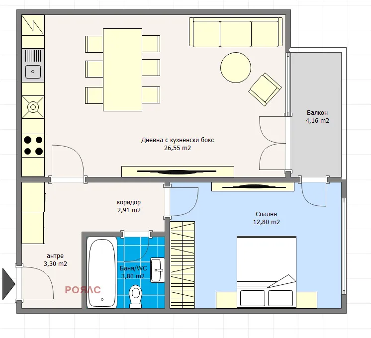 Оферта 37 809 Роялс има удоволствие да Ви представи за продажба двустаен дом, в нова луксозна бутикова сграда в София, зона Б18, централен район на 3 километра от жълтите павета и Народното събрание. На метри от метро станция и автобусни спирки. Разпределение на апартамента: коридор, голяма, просторна и светла дневна с кухненски бокс, спалня, баня и тоалетна в едно, тераса пред дневната . Отличен семеен дом.Възможност за парко място или гараж, които допълнително се заплащат. Този луксозен апартамент е идеален за всички, които търсят качество и комфорт в съвременен стил. Новото строителство гарантира високо ниво на енергийна ефективност и съвременни инженерни решения, които ще осигурят вашето удобство и спокойствие. Елегантните и стилни интериорни решения създават усещане за топлота и уют, а просторните стаи и балкони предлагат впечатляващ изглед към града.Ако имате допълнителни въпроси или желаете да направим оглед, не се колебайте да се свържете с нас: +359 884 939484 .ROYALS ще бъде до вас през целия процес на сделката! Извършваме всички необходими технически и юридически проверки на имота, който сте избрали. Агенцията може да ви съдейства и за отпускане на банков кредит при преференциални условия!ROYALS Недвижими имоти - Чистота. Детайли. Съвършенство.За още предложения посетете нашия сайт: https://royals.bg/