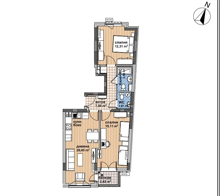 Разпределение: входно антре, топла и светла дневна, голяма родителска спалня, по-малка спалня, баня с тоалетна, отделна тоалетна, балкон, мазе (5 кв.) включено в цената.