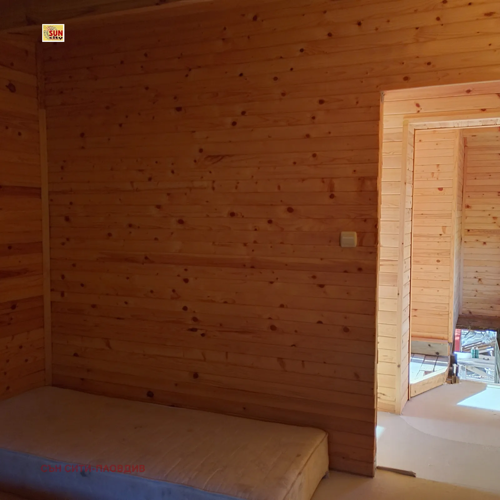 - Първи етаж: една спалня, дневна с бокс и санитарен възел.Етажа е на шпакловка и замазка, вътрешно стълбище.