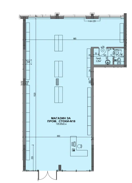 Търговска зала, санитарен възел с предверие, възможност за извеждане на вентилация на покрива
