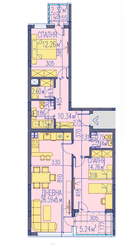дневна с трапезария, 2 спални, баня и wc, wc, дрешник, 2тераси