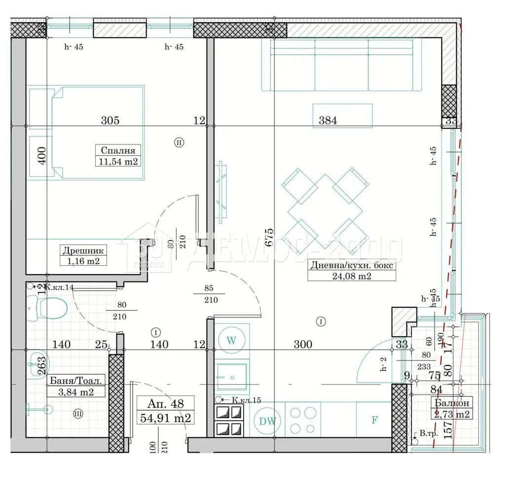 Двустаен апартамент в сграда ново строителство на етап след Акт 14. Апартаментът се намира етаж 8 и се състои от дневен тракт с площ от 24м2, спалня 11м2, баня с WC - 4м2, дрешник -1м2, коридор = 4м2, тераса 3м2, апартамент №48 Примерна схема на разсроченоплащане: 60% - на предварителен договор 30% - при завършване на външната фасада на сградата 10% - Акт 115 Срок на издаване - 12.2026г. Избор на двустайни и тристайни апартаменти. Открити паркоместа - цена при запитване!