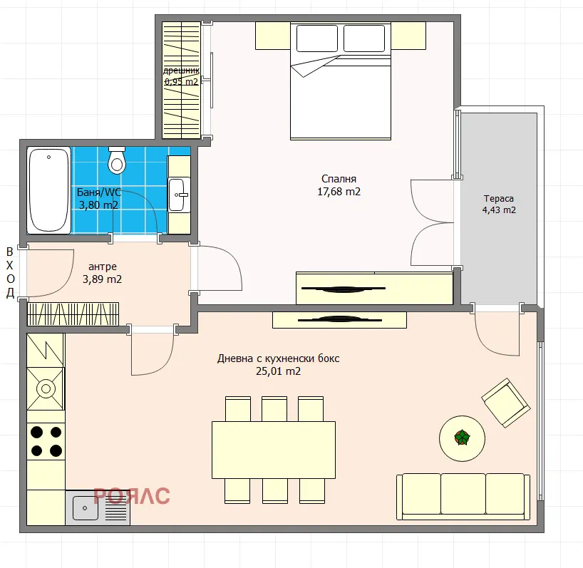 Оферта 37 711 Роялс има удоволствие да Ви представи за продажба двустаен дом, в нова луксозна бутикова сграда в София, зона Б18, централен район на 3 километра от жълтите павета и Народното събрание. На метри от метро станция и автобусни спирки. Разпределение на апартамента: коридор, голяма, просторна и светла дневна с кухненски бокс, спалня, баня и тоалетна в едно, тераса пред дневната . Отличен семеен дом.Възможност за парко място или гараж, които допълнително се заплащат. Този луксозен апартамент е идеален за всички, които търсят качество и комфорт в съвременен стил. Новото строителство гарантира високо ниво на енергийна ефективност и съвременни инженерни решения, които ще осигурят вашето удобство и спокойствие. Елегантните и стилни интериорни решения създават усещане за топлота и уют, а просторните стаи и балкони предлагат впечатляващ изглед към града.Ако имате допълнителни въпроси или желаете да направим оглед, не се колебайте да се свържете с нас: +359 884 939484 .ROYALS ще бъде до вас през целия процес на сделката! Извършваме всички необходими технически и юридически проверки на имота, който сте избрали. Агенцията може да ви съдейства и за отпускане на банков кредит при преференциални условия!ROYALS Недвижими имоти - Чистота. Детайли. Съвършенство.За още предложения посетете нашия сайт: https://royals.bg/