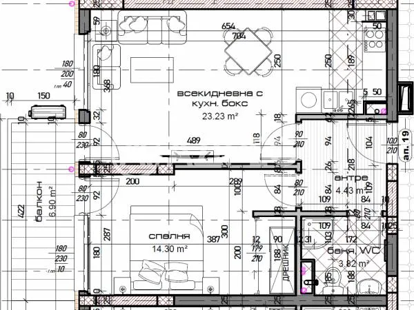 Двустаен апартамент, в нов изключително луксозен жилищен проект с отлична локация в кв. Младост. Жилището се състои от дневен тракт 23.5 кв.м, спалня 14,5 кв.м, баня с тоалет, маза, тераса. Завършен по БДС на шпакловка и замазка, с блиндирана входна врата. Възможност за закупуване на закрито или открито паркомясто или гараж.