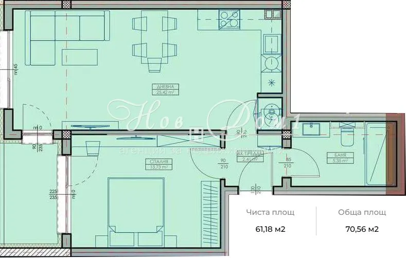 Двустаен апартамент - Функционалност, Правилни форми, Голяма дневна!✨ Представяме Ви отлично проектиран двустаен апартамент, който впечатлява с просторната си дневна и идеалното си разпределение. Този имот е перфектният избор за млади двойки, стартиращи семейства или като инвестиция с висока доходност.Ключови Параметри:Локация: ж.к.Възраждане– Стратегическо местоположение с лесен достъп до всички удобства.Цена: 97 000€.Етаж: 5-ти, осигуряващ тишина, светлина и простор.Обща Площ: 70.56 м² (Чиста Площ: 61.18 м²).📐 Разпределение:Апартаментът е проектиран за максимален уют и функционалност, като всяко помещение е с правилна форма:Просторна Дневна с Кухненски Бокс: 25.42 м² – Перфектно обособени зони за готвене, хранене и почивка. Идеално място за Вашето ежедневие и социални контакти.Спалня: 13.73 м² – Уютна и достатъчно голяма за двойно легло и гардероб.Входно Антре (Коридор): 6.44 м² – Широко и удобно за поставяне на портманто и шкаф за обувки.Баня с WC: 5.35 м² – Функционална голяма и достъпна.✅ Защо Този Апартамент е Вашият Избор?Светлина и Простор: Огромната дневна дава усещане за лукс и свобода, което рядко се среща при двустайните имоти.Отлична Инвестиция: Апартаменти с такова разпределение и квадратура са изключително търсени както за живеене, така и за отдаване под наем.Качествена Сграда: Доказан строител с богато портфолио от качествено построени сгради.📞 Не пропускайте възможността да живеете в дома с най-добрата дневна!Свържете се с нас днес, за да запазите Вашия час за оглед!Забележка: Публикуваните снимки са илюстративни и имат представителен характер. Те са предназначени да онагледят възможното оформление, стил и потенциал на имота след завършване/обновяване. Реалното състояние на имота може да се различава от показаното на изображенията.За допълнителни въпроси и огледи:Консултант недвижими имоти: Боряна Ангелова - 0892 200 970www.novdom1.bg реф. Z-н.83675