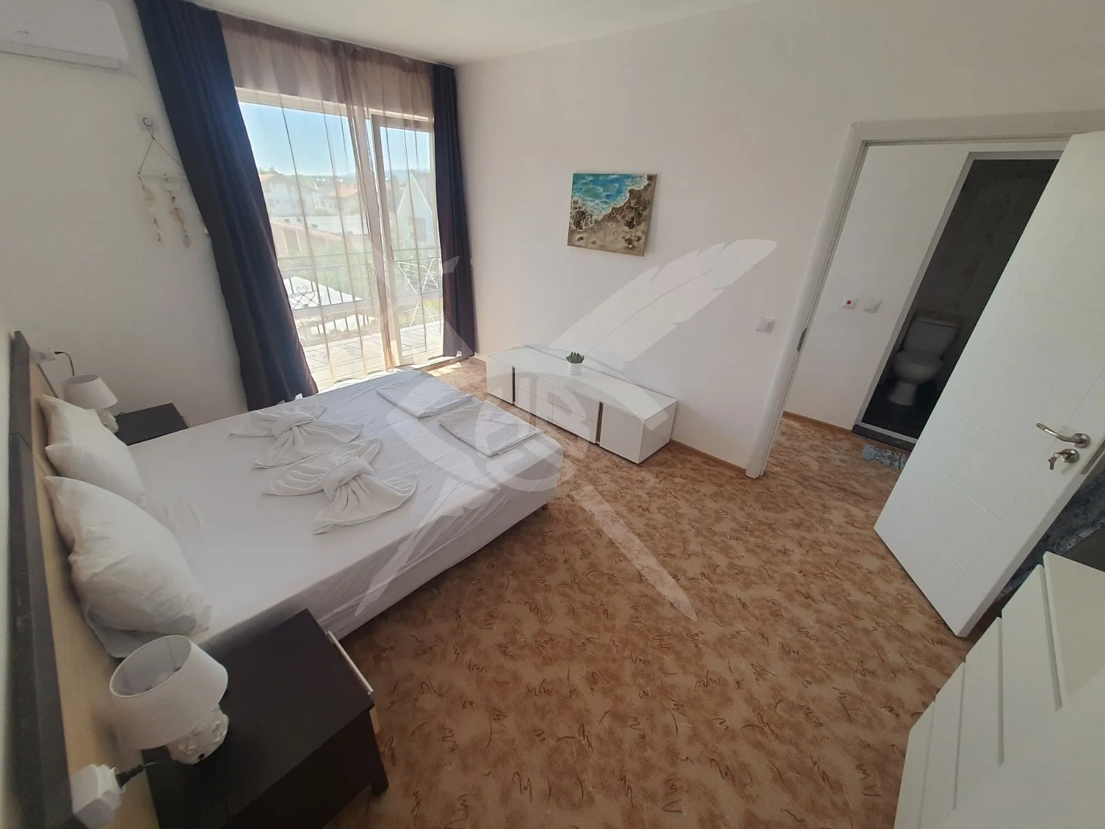 РАЗПРЕДЕЛЕНИЕ: Апартаментът разполага с площ от 60 кв.м, функционално разпределени в спалня, хол с кухненски бокс, баня с тоалетна, и тераса.