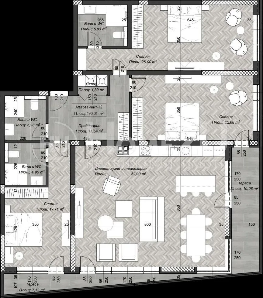 ОТЛИЧНА ЛОКАЦИЯ !!! СТАРТИРАЛО СТРОИТЕЛСТВО !!! ЛУКСОЗНА СГРАДА !!!Представяме на Вашето внимание четристаен апартамент в нова жилищна сграда без аналог на пазара в центъра на столицата. Апартаментът ще разполага със следното функционално разпределение:входно антре, хол + кухненски бокс 52кв.м., три спални (две тип енсюит), още една баня + тоалетна, склад, две тераси 17,20кв.м.Фасадата на сградата е съвременна и модерна с елегантни декоративни елементи, които подчертават обемите. Конструкцията е монолитна стоманобетонна с външни зидове от 25 см. тухли и 10 см. топлоизолация. Терасите са предвидени с ажурни и плътни парапети с височина от мин. 120 см. от готов под. А създаването на общо пространство в градската среда е предизвикателство за осигуряването му по функционален път, което допълва уютната обстановка и качеството на живот. Предвидена е богато озеленена, общодостъпна покривна тераса.Обадете и цитирайте код: 144283