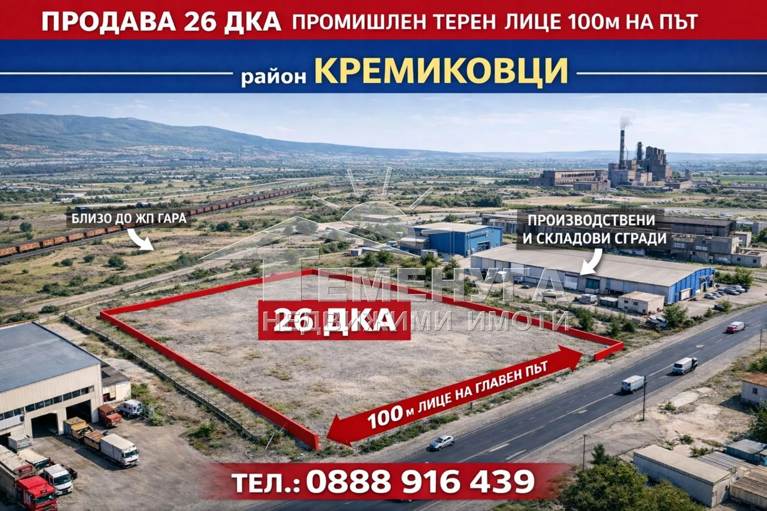 Промишлено-складов терен 26 300 кв.м с лице 130 м – Индустриална зона Кремиковци, СофияПредлагаме за продажба атрактивен промишлено-складов имот с площ 26 300 кв.м, разположен в утвърдената индустриална зона Кремиковци, с голямо лице от 130 метра към съществуващ асфалтиран път.Имотът се намира на стратегическа локация с отлична логистична осигуреност и бърз достъп за тежкотоварен транспорт – директна връзка с Околовръстно шосе, Северна тангента, АМ Хемус, както и товарна ЖП гара, което го прави изключително подходящ за индустриални и логистични проекти.Теренът е равен, с правилна форма, без денивелация – оптимален за ефективно застрояване и организация на производствени и складови площи.Устройствени показатели:Зона: Пмс (производствени и складови дейности – малки и средни предприятия)Плътност на застрояване: 50%КИНТ: 1,5Кота корниз: 10 мВ момента имотът е в процедура по ПУП–ПРЗ и ИПУР, с налични съгласувателни писма от Електрохолд, Овъргаз и Софийска вода, което значително съкращава сроковете за реализация на инвестиционен проект.Съществуваща инфраструктура:Директен достъп до асфалтиран пътКанализацияВодопроводПодходящ за:складова и логистична базалогистичен центърчисти производствафабрика / производствен комплекстърговско-складов центърИмот с отличен инвестиционен потенциал, съчетаващ мащаб, комуникативна локация и готовност за развитие – рядка възможност в рамките на София.