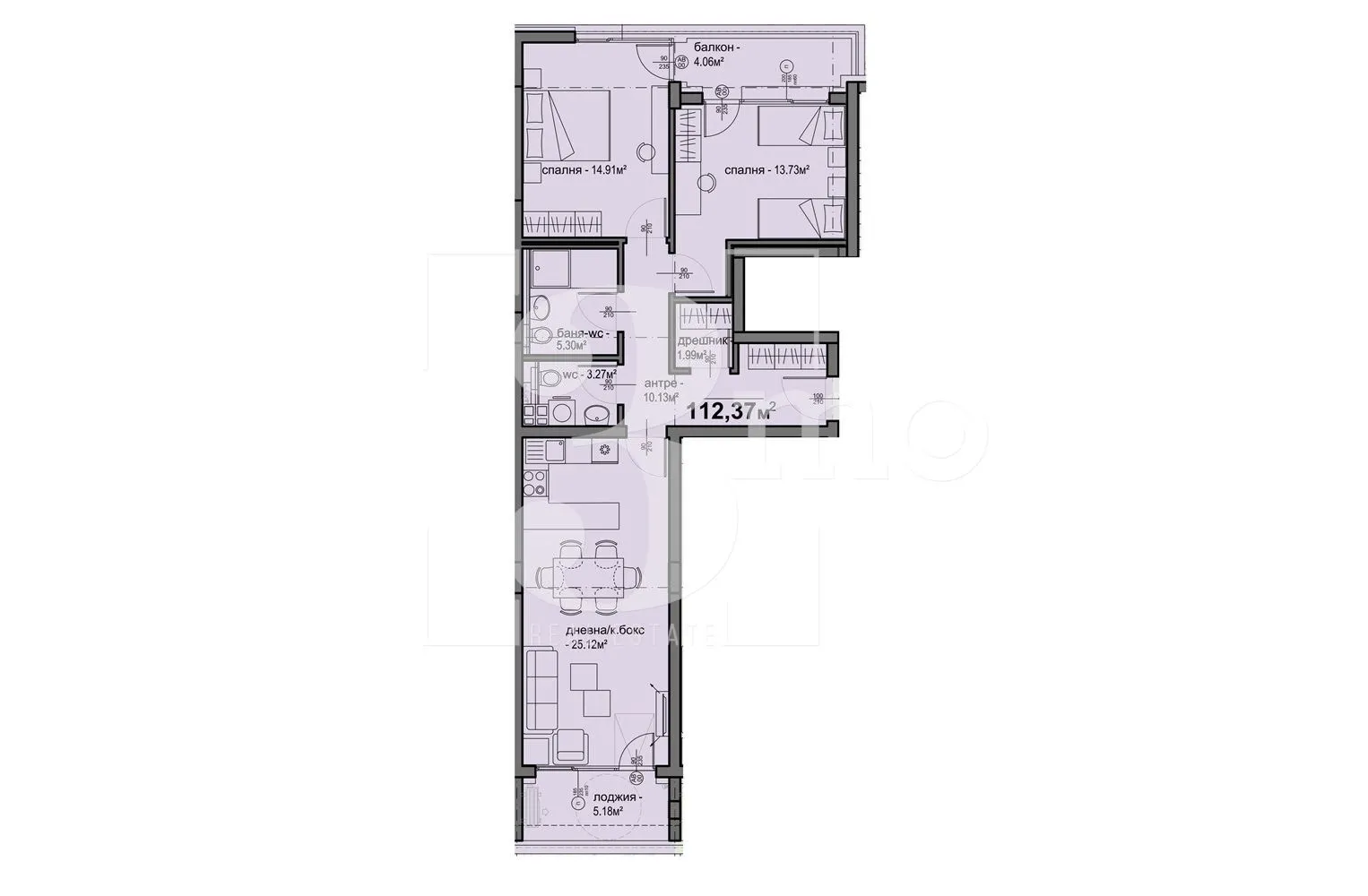 3mo Амалтея има удоволствието да Ви предложи тристаен апартамент в нова модерна жилищна сграда. Планирано разрешение за ползване в края на 2026-та година. Намира се в ж.к. Люлин 5 на комуникативно място. Предложеният имот е с обща площ от 112,37 кв.м. (застроена 100 кв.м.) и се състои от: входно антре (10,13 кв.м.), всекидневна с кухненски бокс и трапезария (25,12 кв.м.) с лоджия (5,18 кв.м.), спалня (14,91 кв.м.), втора спалня (13,73 кв.м.), балкон (4,33 кв.м.), дрешник/складово помещение (1,99 кв.м.), баня с тоалетна (5,30 кв.м.) и отделна тоалетна (3,27 кв.м). Жилището е разположено на осми от общо девет етажа. Има изложение изток и запад. Отоплението е чрез газ. Към имота може да се закупи паркомясто или гараж. Инвеститорът е с богат опит, специализиран в изграждането на качествени жилищни сгради, като прилага най-новите технологии и иновации в строителството. В близост до имота са разположени множество търговски, хранителни и денонощни магазини и обекти. Също така детска градина, училище и удобен градски транспорт с бърз превоз до метростанции "Люлин", "Западен парк" и "Сливница". Връзката с централната и други части на столицата се осъществява посредством бул. "Петър Дертлиев", бул. "Добринова скала" и Околовръстен път.