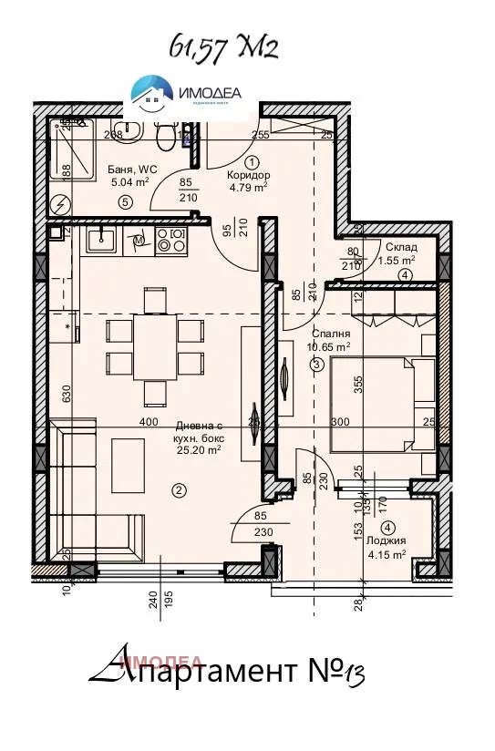 Разпределение: входно антре, просторна дневна с кухненски бокс, спалня, баня с тоалетна и тераса с южна ориентация.