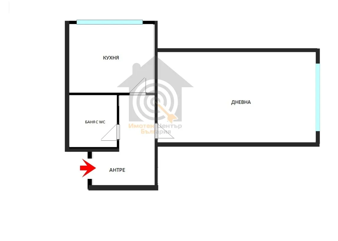 *ПРЕУСТРОЕНА в двустаен апартамент- антре,баня с WC, дневна с кухненски бокс, отделна спалня + ГОЛЯМА ТЕРАСА /8м2/пред двете помещения!!!