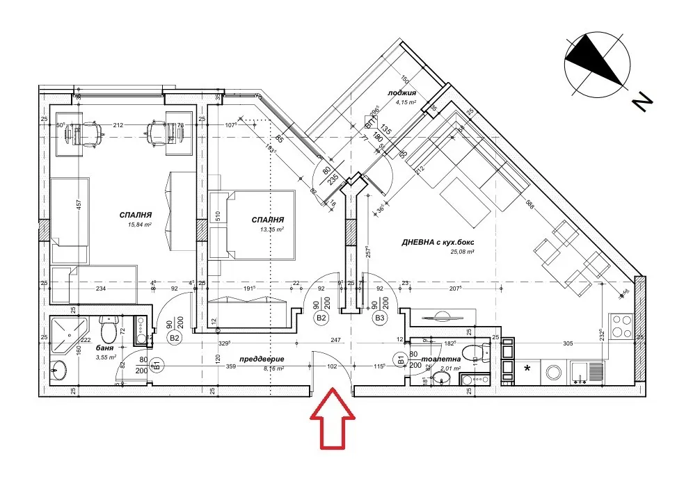 Разпределение: входно антре, просторен хол с трапезария и кухненски бокс, две спални, баня с тоалетна, тоалетна, една тераса.