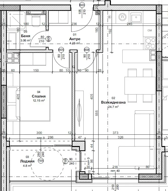 Дневна с кухенски бокс 28,71 м2 с лоджия 4.8 м2