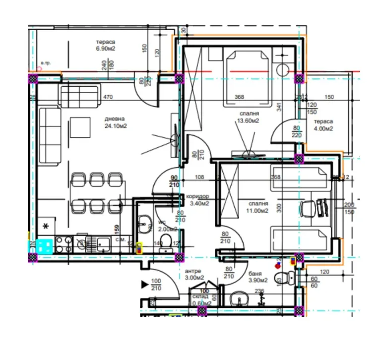Две малки сгради с по 4 етажа разпределение по етажите - сутерен гаражи и апартаменти, и три жилищни етажа.
