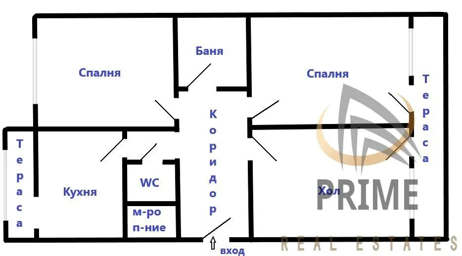 РАЗПРЕДЕЛЕНИЕ: коридор, разширена кухня с трапезария, хол, две спални, баня, тоалетна, тераса.