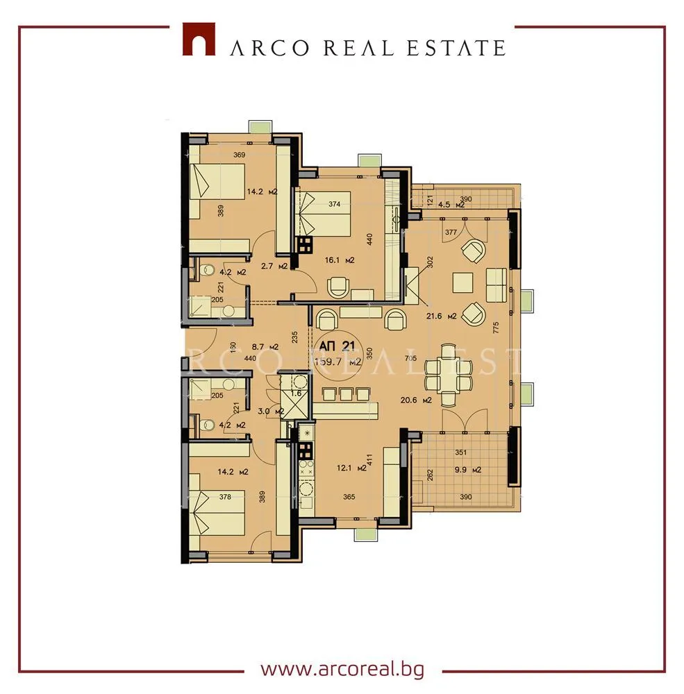 ARCO REAL ESTATE предлага просторен 4-стаен апартамент в кв.Горна Баня.Имотът се намира на пети етаж от многофамилна жилищна сграда, която трябва да бъде завършена в средата на 2027. Обектът е до ортопедичната болница, в зелен район с бърз достъп до околовръстното шосе. Жилището е с три изложения - изток, юг и запад, чиста застроена площ от 159.70 кв.м и се състои от голям хол с трапезария и кухненски бокс (54.3 кв. м.), с излаз на тераса (9.9 кв. м.) три спални (14.2 и 14.2 и 16.1 кв. м) и две санитарни помещения.Сградата ще бъде изпълнена с висококачествени материали, с вентилируема фасада, нискоемисионни стъклопакети, изолация с каменна вата. Общтите части ще бъдат луксозно изпълнени с пространство за велосипеди и детски колички, а отоплението в имота ще бъде на газ.Паркирането е решено с гаражи и паркоместа на сутеренно и партерно нивоСхемата на плащане е 10%" на предварителен договор, а останалите 90% се договарят според нуждите на купувача.За повече информация и огледи:Янчо Михайлов - 0878 916 599 yancho.mihaylov@arcoreal.bgПетър Герджиков - 0894 304 471 petar.gerdzhikov@arcoreal.bgARCO REAL ESTATE предлага безплатно съдействие при ипотечно кредитиране и изготвяне на пазарна оценка.Имейл yancho.mihaylov@arcoreal.bgТелефон 0878 916 599