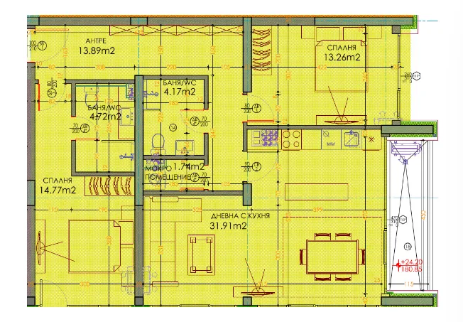дневна с кухня, 2 спални, 2 бани с тоалетни, мокропомещение, склад, 2 покривни тераси