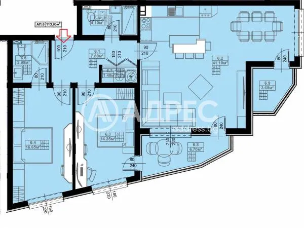 Агенция за недвижими имоти АДРЕС има удоволствието да Ви представи НОВ проект на 10 мин пешеходно разстояние до центъра на града, в района на Алеята на здравето. Сградата се състои от партерен етаж, четири жилищни етажа с по шест апартамента на етаж, като всички от тях притежават компактно и функционално разпределение на площите, апартаментите ще бъдат с квадратури от 59 кв.м до 165 кв.м. На партерният етаж са позиционирани паркоместата. Предлаганият апартамент № 6 е ситуиран на първи жилищен етаж с чиста площ от 113,95 кв.м /с общи части 129,58 кв.м/ и има следното разположение: разпределителен коридор, просторна всекидневна с кухненски бокс, две спални помещения, два бани и два санитарни възела, мокро помещение и две тераси. Степен на завършеност: подова замазка, положена фина мазилка на стените и таваните, ВиК- до тапа, Ел. - до точка, PVC дограма, външна топлоизолация, монтирана входна врата, отлично завършени общи части и модерен хидравличен асансьор. Възможност за гъвкава схема на плащане, според степента на завършеност! За повече информация относно цени и квадратури, може да се обадите на посочените телефони. Новастрояща се сграда с модерна визия в района на Алеята на здравето Обади се сега и цитирай този код Z-621831