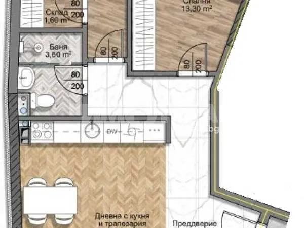 Тристаен апартамент изложение север-юг и с чиста площ 81,36 кв.м. Състои се от дневна с кухня и трапезария- 23 кв.м., две спални съответно по 13,20 кв.м. и 13,30 кв.м., скляд, южна тераса 4,60 кв.м.