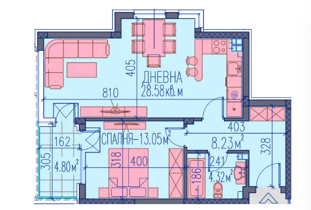 дневна с трапезария, спалня, баня+wс, тераса