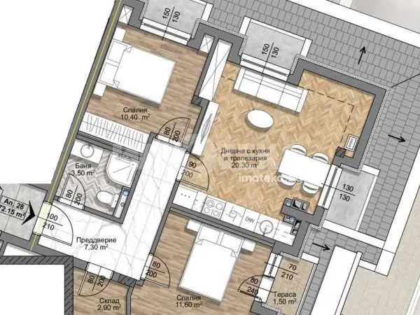 Тристаен апартамент със североизточно изложение и с чиста площ 72,15 кв.м. Състои се от дневна с кухня и трапезария- 20,30 кв.м., две спални съответно по 11,60 кв.м. и 10,40 кв.м., един санитерен възел, склад и югоизточна тераса 1,50 кв.м.
