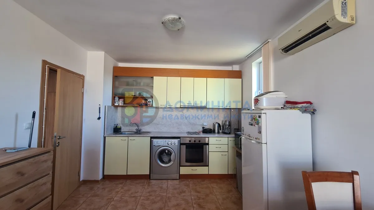 Апартаментът предлага отлично вътрешно разпределение: функционално антре с място за шкафове за съхранение, просторен хол с оборудвана кухня 🍽️, уютна спалня 🛏️ и баня със санитарен възел 🚿. Има и прекрасна тераса ☀️ с частична гледка към морето, достъпна от двете стаи, идеална за сутрешно кафе или вечерни моменти на открито.