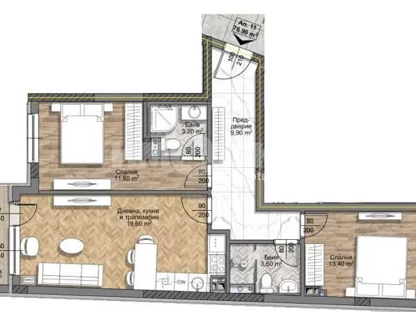Тристаен апартамент изложение изтжк-запад и с чиста площ 76,90 кв.м. Състои се от дневна с кухня и трапезария- 19,50 кв.м., две спални съответно по 11,80 кв.м. и 13,40 кв.м., западна тераса 3,30 кв.м.