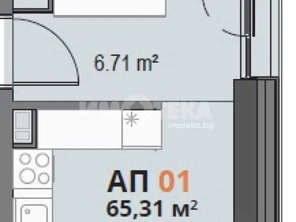 Двустаен апартамент, състоящ се от дневна с кухненси бокс, спалня , баня с тоалетна и тераса.