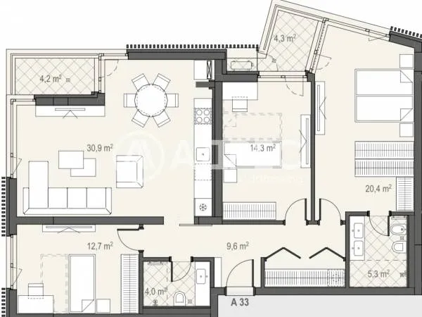 Многостаен апартамент с югозападно изложение и площ от 143 кв.м. Състои се от просторен хол с кухненски бокс, три големи спални, едната със самостоятелна баня с WC, втора баня с WC, две тераси. Сграда на доказан Инвеститор.