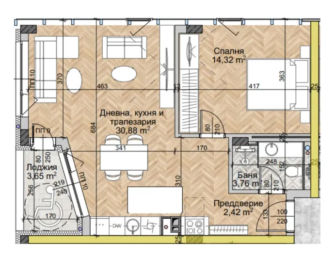 Ап. 12, на първи жилищен етаж/ над търговски площи и гаражи /, кота + 4,00. Изложение: СИ/СЗ/З и площ от 78,80кв обща квадратура. В посочената квадратура се включва чиста площ на жилището, склад и общите части. Възможнот за закупуване или под наем на гараж или паркомясто на партер/сутерен.