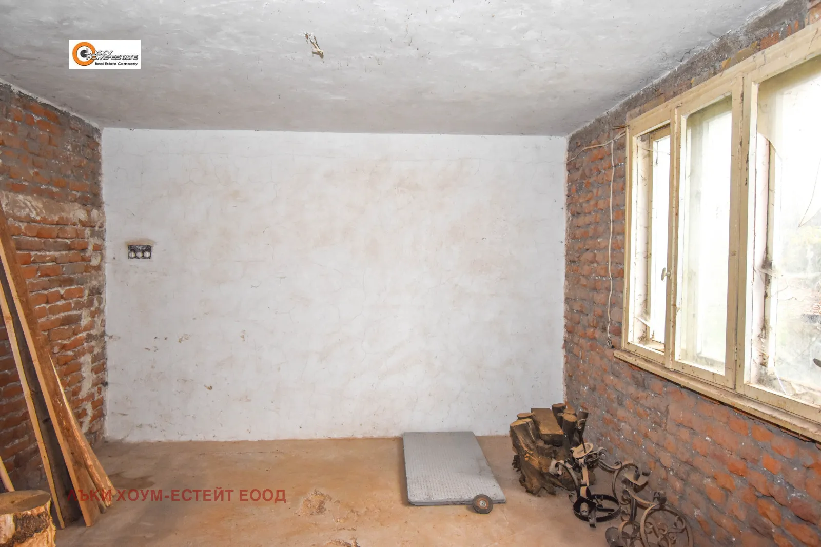 Масивна тухлена сграда 132 кв.м. с плоча, дървена дограма, здрав покрив, вътрешни стълби. Двор 708 кв.м., равен с прекрасна градина, овощни дръвчета и гараж 17 кв.м., кладенец, лятна кухня, също масивна сграда 34 кв.м. Имотът е с изрядни документи.