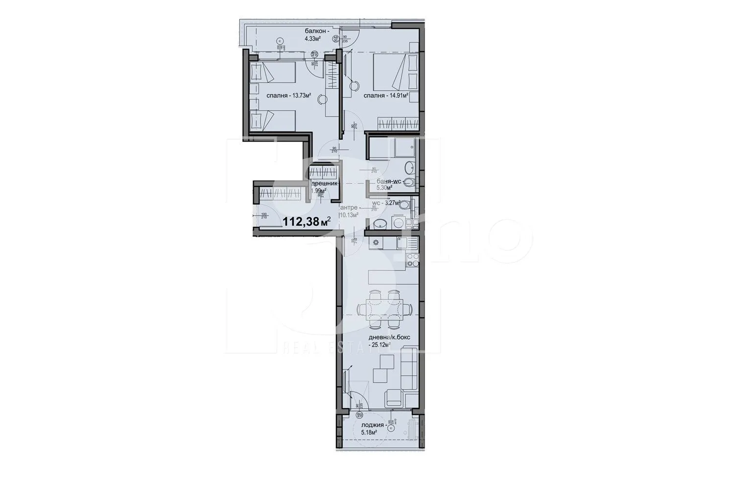 3mo Амалтея има удоволствието да Ви предложи тристаен апартамент в нова модерна жилищна сграда. Планирано разрешение за ползване в края на 2026-та година. Намира се в ж.к. Люлин 5 на комуникативно място. Предложеният имот е с обща площ от 112,38 кв.м. (застроена 100 кв.м.) и се състои от: входно антре (10,13 кв.м.), всекидневна с кухненски бокс и трапезария (25,12 кв.м.) с лоджия (5,18 кв.м.), спалня (14,91 кв.м.), втора спалня (13,73 кв.м.), балкон (4,33 кв.м.), дрешник/складово помещение (1,99 кв.м.), баня с тоалетна (5,30 кв.м.) и самостоятелна тоалетна (3,27 кв.м). Жилището е разположено на осми от общо девет етажа. Има изложение изток и запад. Отоплението е чрез газ. Към имота може да се закупи паркомясто или гараж. В същата сграда и в района продаваме най-разнообразни апартаменти. Инвеститорът е с богат опит, специализиран в изграждането на качествени жилищни сгради, като прилага най-новите технологии и иновации в строителството. В близост до имота са разположени множество търговски, хранителни и денонощни магазини и обекти. Също така детска градина, училище и удобен градски транспорт с бърз превоз до метростанции "Люлин", "Западен парк" и "Сливница". Връзката с централната и други части на столицата се осъществява посредством бул. "Петър Дертлиев", бул. "Добринова скала" и Околовръстен път.