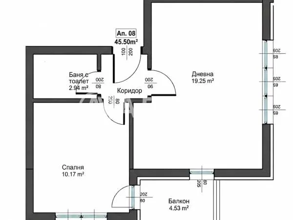 Жилището разполага с площ от 45 кв.м. разпределена в коридор, светъл дневен тракт с кухненски бокс, спалня, тераса, баня и тоалетна.
