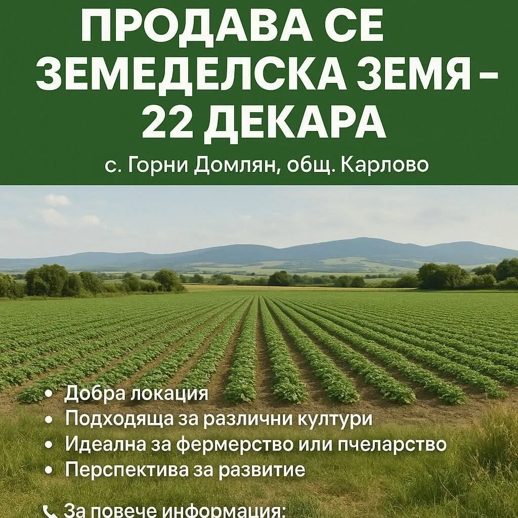 Продаваме 22 дка земеделска земя в землището на с. Горни Домлян, общ. Карлово.