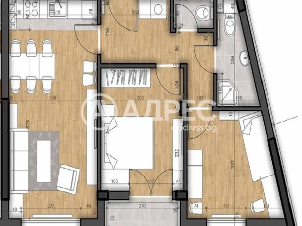 Състои се от: две спални, дневна с трапезария и кухненски бокс, тоалетна, баня с тоалетна, тераса, входно антре. Възможност за закупуване на гараж.