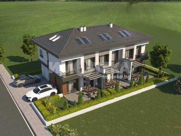 Къща 1 - първи етаж: дневна с кухненска част с излаз на веранда, баня с тоалетна и складово помещение. Втори етаж - три спални (двете детски са по 12 кв.м, родителската е 15 кв.м.), баня с тоалетна и излаз към таванско помещение с площ от 40 кв.м. Дворното място към къща 1 е 40 кв.м. Цената е 185 000 евро. Към нея могат да бъдат закупени 2 бр. парко места.