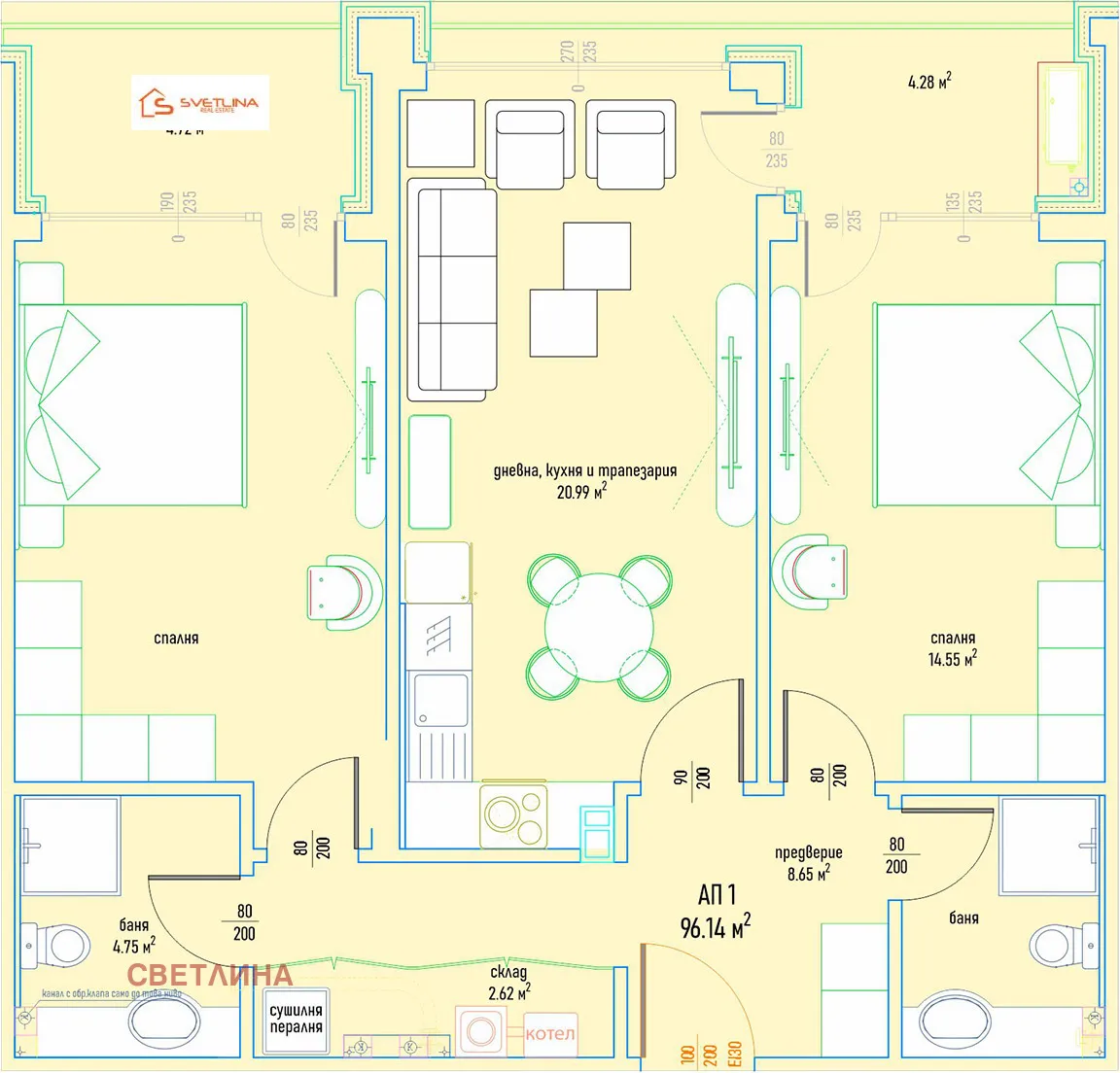 Жилището посочено в офертата е ситуирано на първи етаж със застроена площ от 96 кв.м. общи части 23 кв.м.