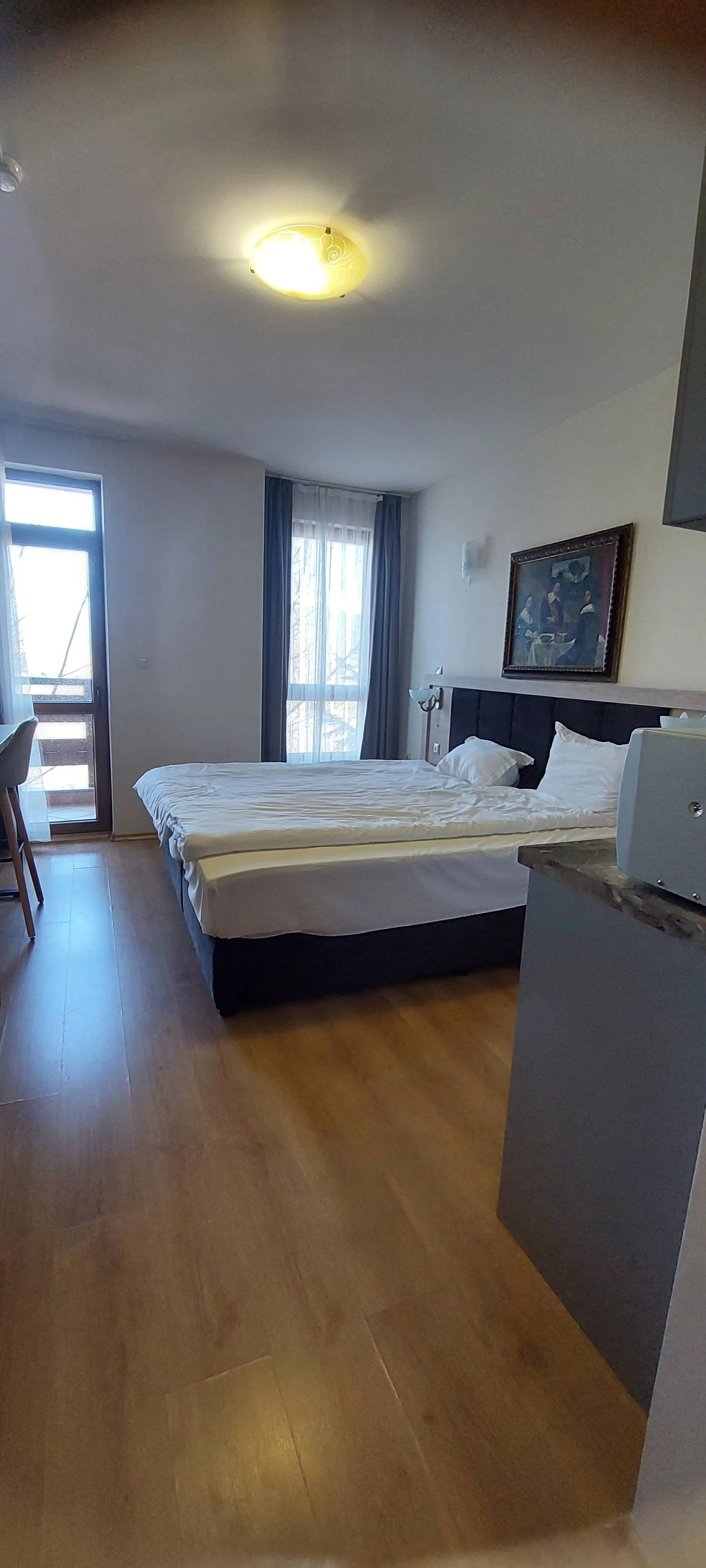 Агенция за недвижими имоти Hello Bulgaria с удоволствие предлага просторен и напълно обзаведен студио апартамент в уютен жилищен комплекс, разположен само на 10 минути с автомобил от снежните писти на Банско.