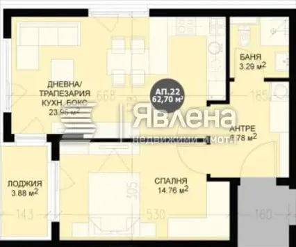 Просторна дневна с кухня и трапезария - 47.66 кв.м, с излаз към балкон - 2.94 кв.м